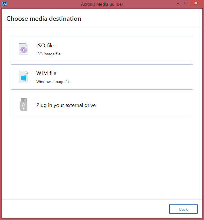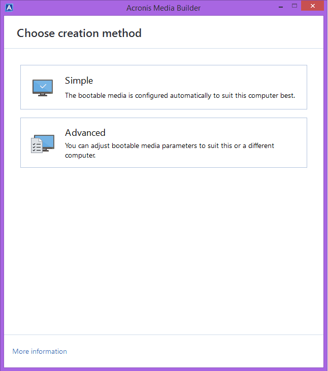 ♨ SimpleAcronis True Image will automatically choose the optimal media type for your computer, creating either WinRE-based media for Windows 7 or later versions, or Linux-based media for earlier versions.
