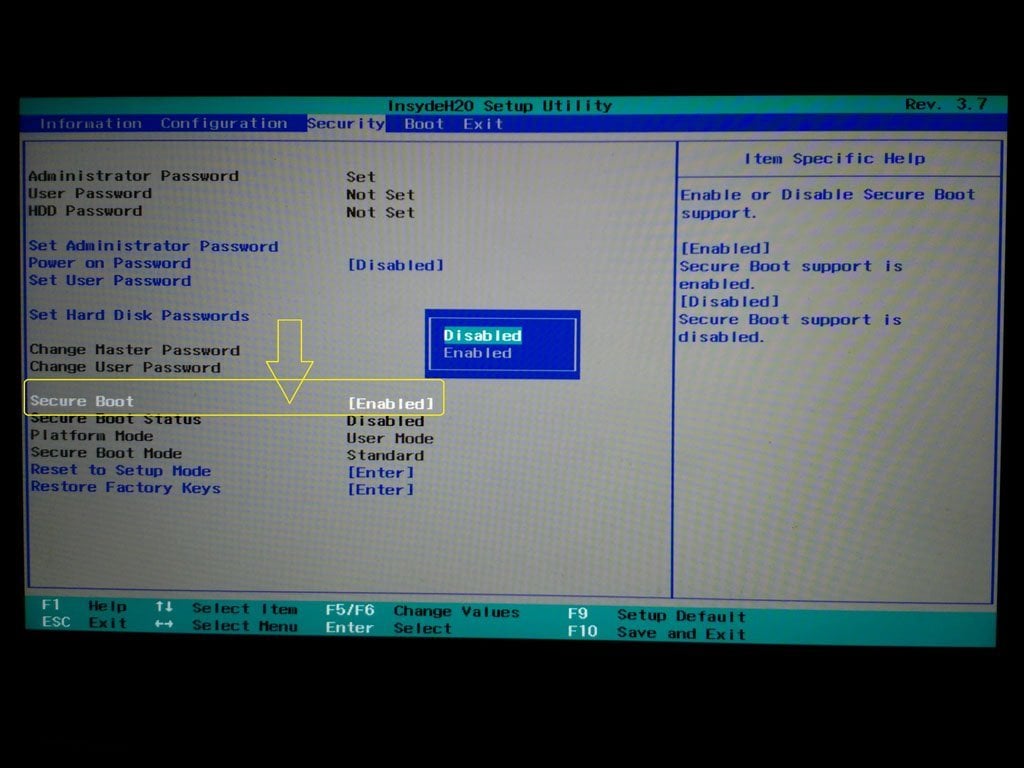Step 3. After turning off "Secure Boot", press F10 to save the setting and exit BIOS.