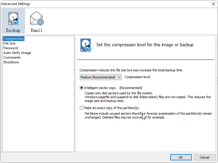 Options allows you to encrypt, split, compress, comment, use VSS, intelligent sector backup, enable email notification, etc. in addition to the premium feature of encrypting.