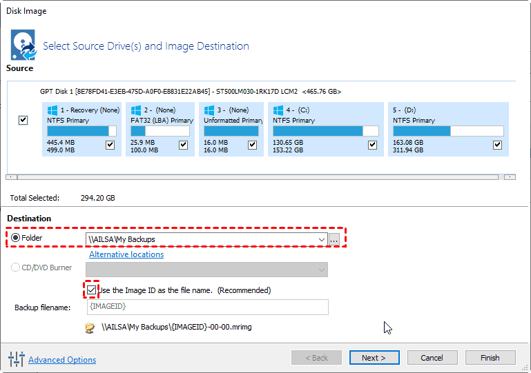 5. Preview the Windows 10 disk backup settings, and click Finish.