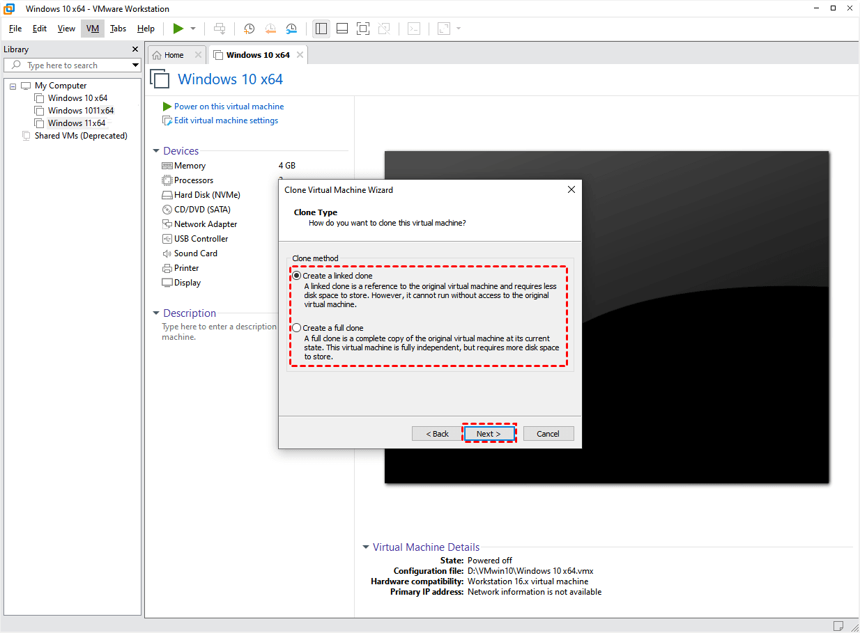 3. To start, you'll need to designate the clone type. This involves deciding whether to create a linked clone or a full clone. A linked clone is a copy of the original virtual machine that still references the original's disk space, whereas a full clone is an independent copy that has its own disk space.