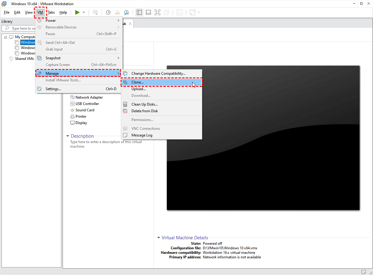 1. To clone a VM in VMware Workstation, launch the application, select the VM you want to clone, click VM on the upper bar, and select Manage > Clone… to open the Clone Virtual Machine Wizard. Then, click Next in the prompt window.
